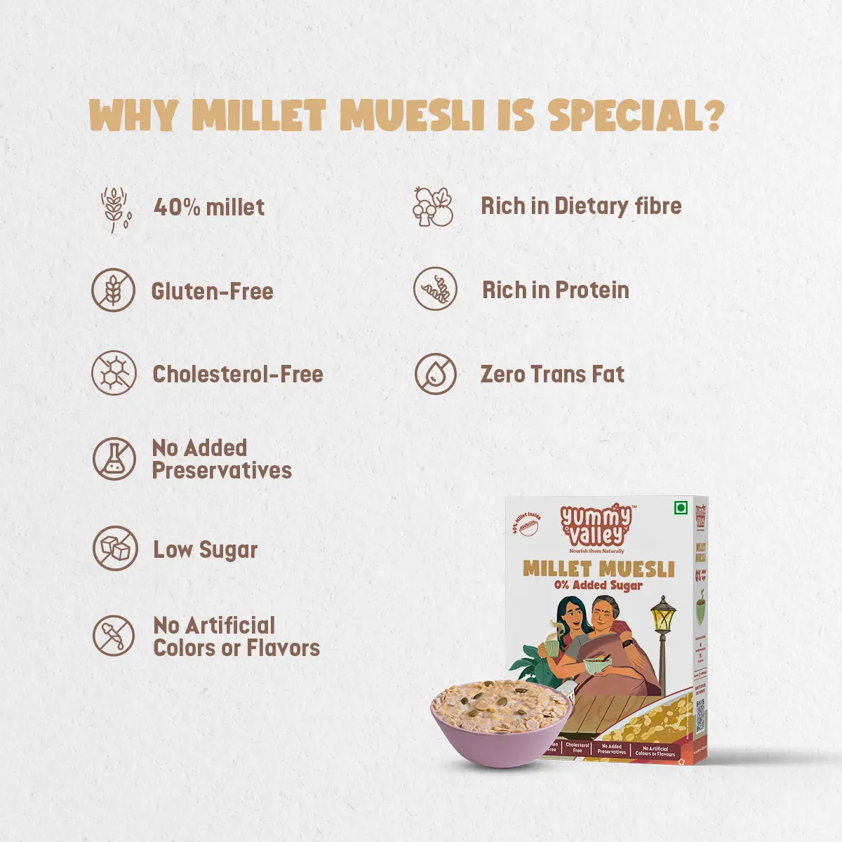 Celebrating family bonds and healthy living – our 0% Added Sugar Millet Muesli captures love, made with care. It’s not just breakfast, it’s a family tradition. Delight your taste buds and nourish your body with No Added Sugar Muesli – a comforting morning ritual, crafted with love to bring joy to your breakfast table.