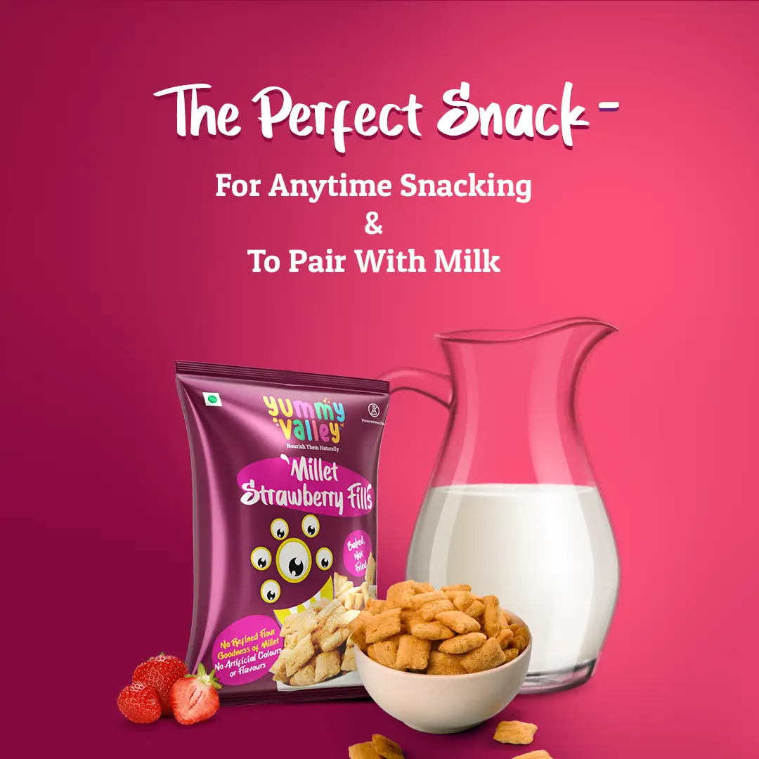 Need a Quick healthy snack? Try Millet Strawberry Fills. Made with the Goodness of Jowar Millet & Strawberry. Enjoy the sweet and delicious flavours of strawberry along with nutritious qualities of millet.