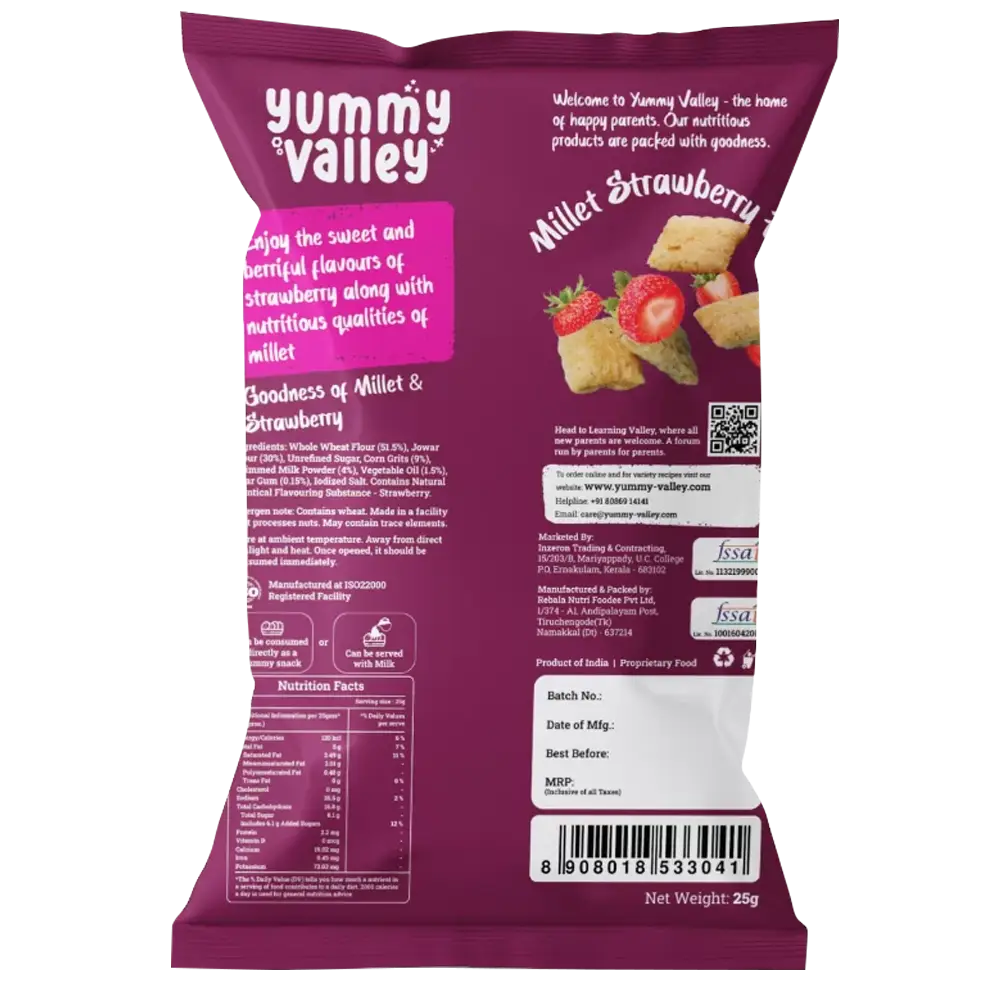 Yummy Valley’s Millet Strawberry Fills is made with the Goodness of Jowar Millet & Strawberry that are loaded with nutrients. Strawberry is a great source of vitamin C, an essential nutrient for staying healthy. Contains Protein, Vitamin D, Calcium, Iron, Potassium and Antioxidants.